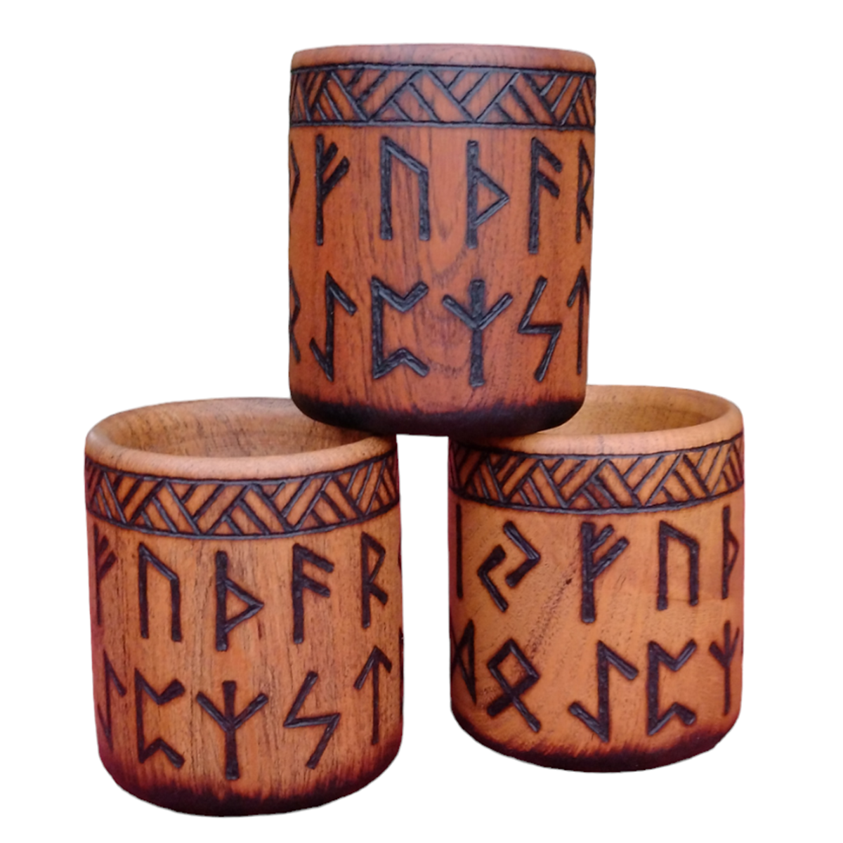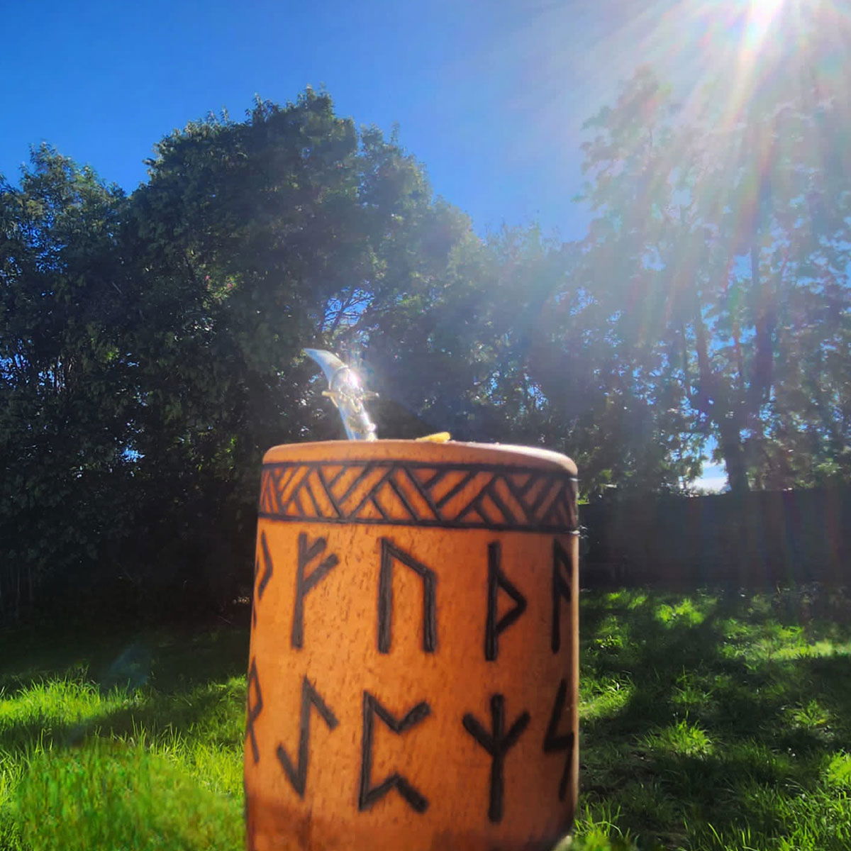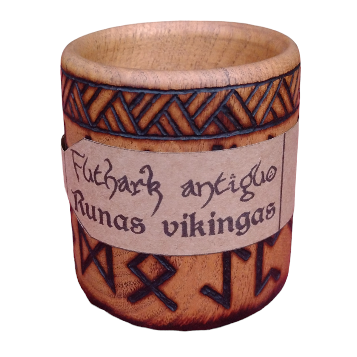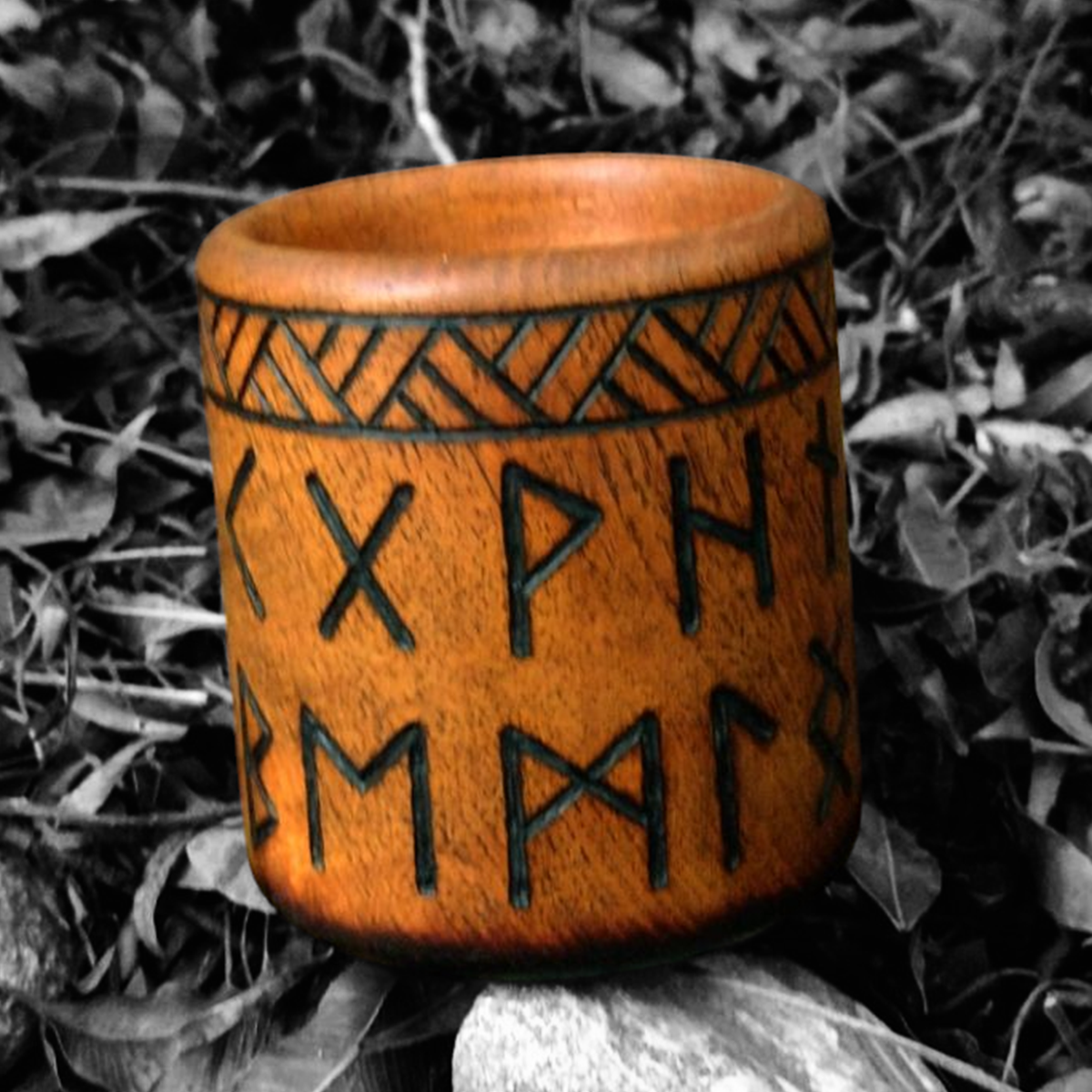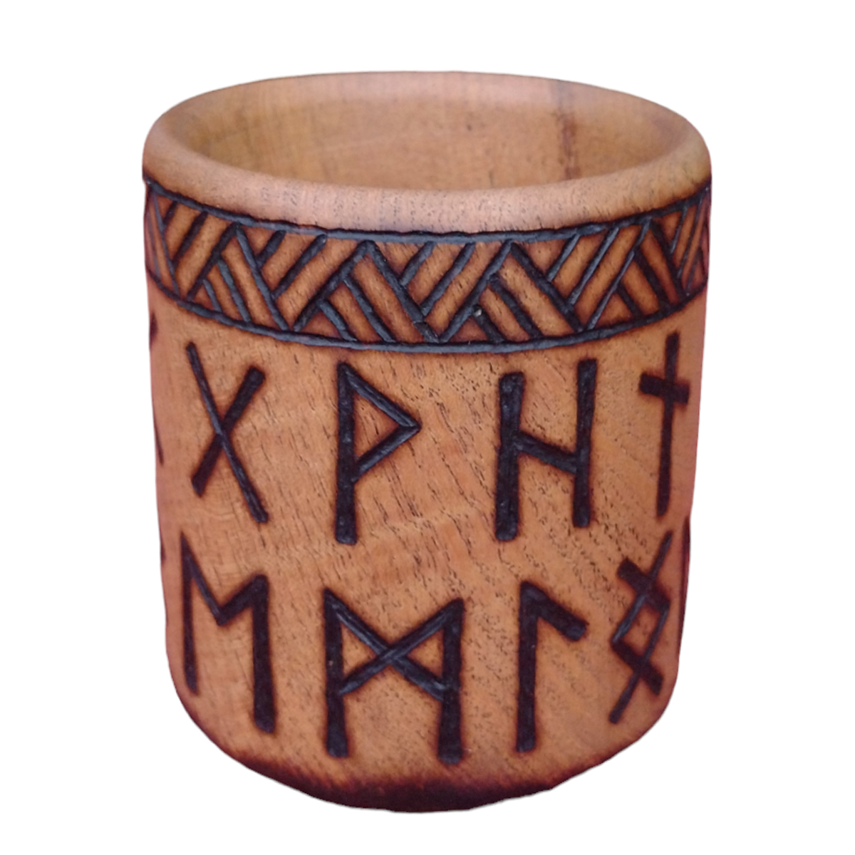 Vaso / mate vikingo artesanal de madera de algarrobo, pirograbado a mano con guarda tradicional y 24 runas.