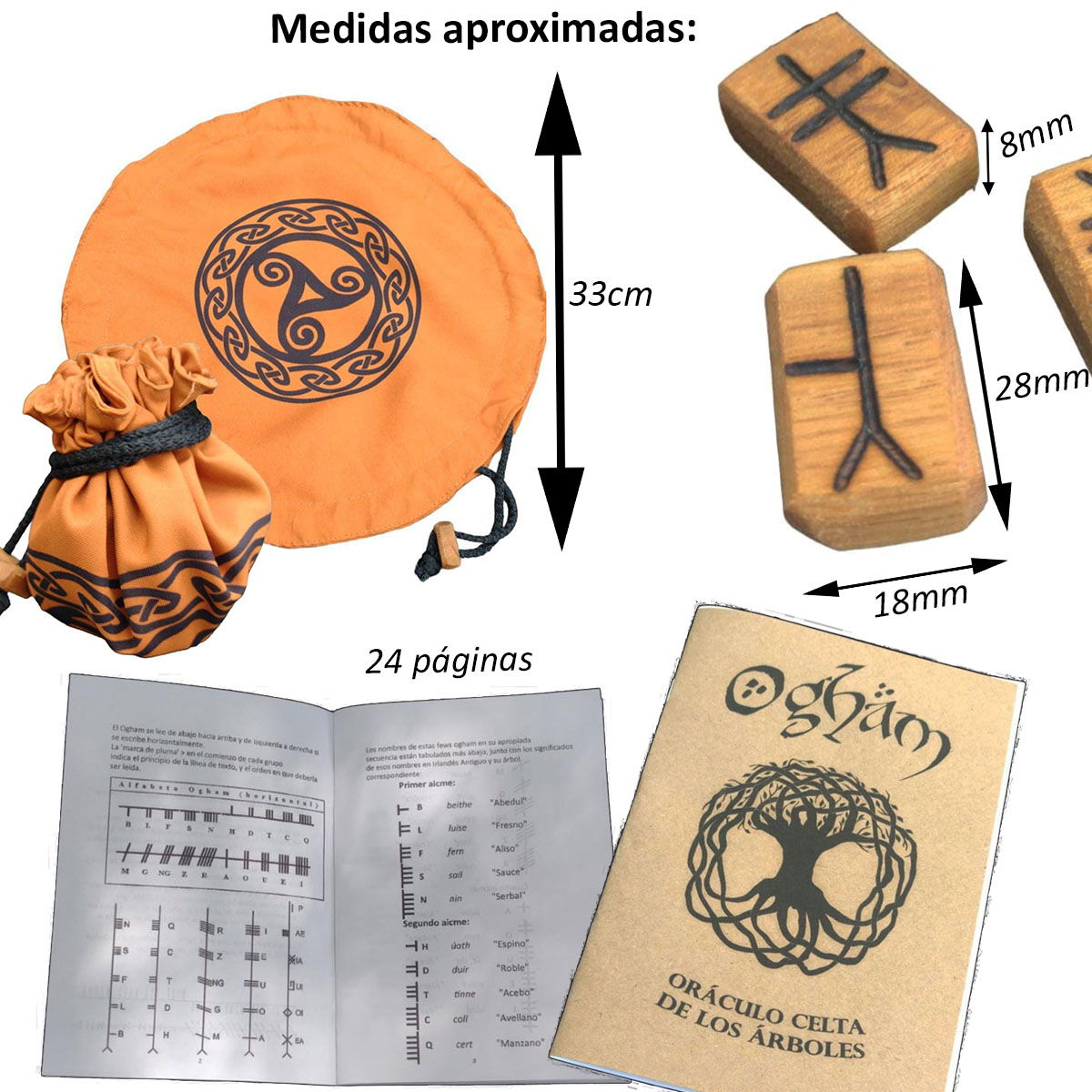 El Ogham Celta, un alfabeto de más de 1600 años de antigüedad, fue utilizado por los druidas celtas y pictos tanto como escritura como oráculo. Cada una de las 20 piezas de este set representa un árbol sagrado y significativo de la tradición druídica.